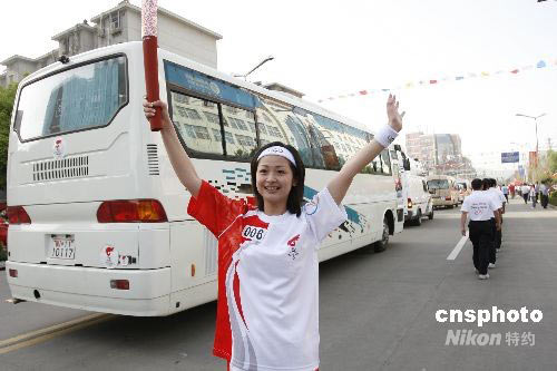 5月29日,奧運(yùn)圣火在“能源之都”淮南傳遞。圖為與白血病魔頑強(qiáng)斗爭(zhēng)的女大學(xué)生,奧運(yùn)火炬手孫潔,她高舉火炬并為四川加油。她說(shuō)她的生命奇跡不僅來(lái)自她的堅(jiān)強(qiáng)毅力,更是來(lái)自社會(huì)的愛(ài)。她告訴四川人民,我們一起加油。 中新社發(fā) 張婭子 攝