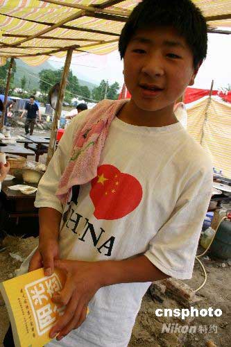 5月28日,在四川汶川大地震重災(zāi)區(qū)之一的彭州,尚未復(fù)課的小魚洞小學(xué)學(xué)生楊青科,拿著一本《陽光心態(tài)》的書翻看,樂觀面對震后生活。中新社發(fā) 楊杰 攝