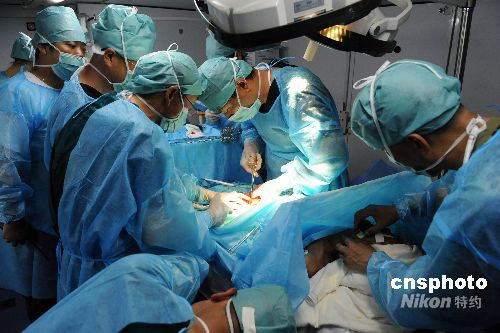 5月27日晚七點(diǎn),四川都江堰市下起大雨造成市政停電。一名患者來到解放軍總醫(yī)院醫(yī)療隊(duì)就診,接診醫(yī)生初步診斷為急腹診,并立即在醫(yī)療隊(duì)野戰(zhàn)外科醫(yī)院野戰(zhàn)手術(shù)車內(nèi)利用自給電進(jìn)行手術(shù)。經(jīng)開腹探查病人為結(jié)腸癌合并結(jié)腸穿孔,危及生命。經(jīng)過20余名專家通力合作,手術(shù)獲得成功。中新社發(fā) 孔令占 攝