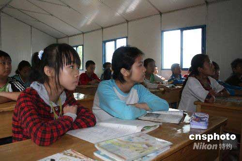 5月29日,文縣碧口小學(xué)學(xué)生在剛剛建成的抗震希望小學(xué)活動(dòng)板房里上課,這是甘肅省重災(zāi)區(qū)隴南在廢墟上建成的第一所災(zāi)區(qū)希望小學(xué)。由共青團(tuán)甘肅省委和甘肅省青少年基金會(huì)募集資金100多萬元建成的學(xué)校,共搭建活動(dòng)板房教室22間1320平方米,可容納全校1200多名學(xué)生上課。中新社發(fā) 劉二銀 攝