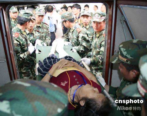5月29日,徐州火車(chē)站,武警戰(zhàn)士小心地將傷員抬下火車(chē)。當(dāng)天,130名四川地震災(zāi)區(qū)傷病員乘坐“救28/7次”特殊專(zhuān)列順利抵達(dá)江蘇徐州。抵達(dá)后,他們迅速被安排到徐州市第一人民醫(yī)院、徐州醫(yī)學(xué)院附屬醫(yī)院等市區(qū)四家大醫(yī)院做進(jìn)一步治療。中新社發(fā) 蔡廣銀 攝