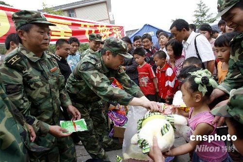 五月三十一日,四川省都江堰市紫坪鋪鎮(zhèn)望江村的孩子們收到了部隊贈送的兒童節(jié)禮物。四川預備役高射炮步兵師四團負責都江堰市望江、黎明、白沙三個行政村的救災工作。兒童節(jié)前夕,該團為孩子們準備了書包、玩具,送給當?shù)氐暮⒆觽。中新社發(fā) 慎重 攝