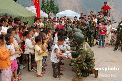5月31日,在四川綿竹市金花小學(xué)校址的廢墟旁邊,38名在地震中幸存的小學(xué)生和中國(guó)空降兵“上甘嶺特功八連”所在團(tuán)的官兵們一起迎接“六一”兒童節(jié)。地震災(zāi)害發(fā)生以后,該團(tuán)是首支進(jìn)駐金花鎮(zhèn)執(zhí)行抗震救災(zāi)任務(wù)的部隊(duì)。在“六一”兒童節(jié)來(lái)臨之際,官兵們和孩子們一起在小學(xué)倒塌的廢墟邊舉行升旗儀式,唱起國(guó)歌。官兵們還向孩子們贈(zèng)送用自發(fā)捐款購(gòu)買的學(xué)習(xí)和生活用品。中新社發(fā) 陳翊 攝