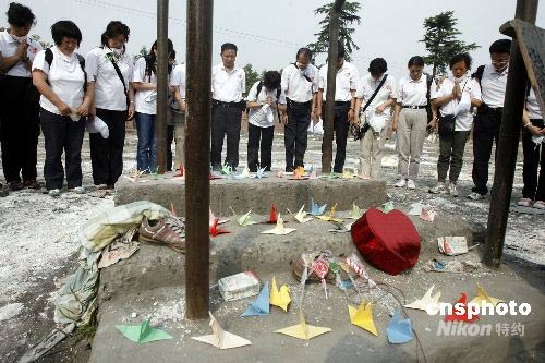 六月一日,來自上海的志愿者在四川省都江堰市向地震遇難孩子默哀。當(dāng)日,國際兒童節(jié),都江堰聚源中學(xué)塌樓的廢墟前,許多人沉痛祭奠遇難學(xué)生。中新社發(fā) 慎重 攝