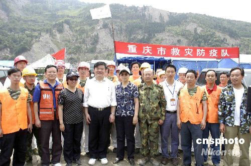 6月2日,中國(guó)衛(wèi)生部長(zhǎng)陳竺到映秀視察抗震救災(zāi)衛(wèi)生防疫工作,圖為陳竺在重慶衛(wèi)生防疫隊(duì)的駐地慰問(wèn)衛(wèi)生防疫隊(duì)員。中新社發(fā) 肖邦忠 攝
