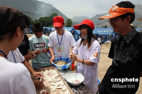 因地震被安置在北川縣擂鼓鎮(zhèn)安置點(diǎn)的受災(zāi)民眾陳艷(右二),在熱心地為志愿者包餃子,以感謝他們?yōu)楫?dāng)?shù)厥転?zāi)民眾辛勤服務(wù)所做的奉獻(xiàn)。中新社發(fā) 毛建軍 攝