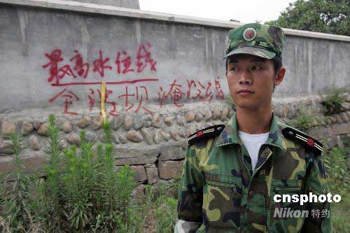 6月6日,四川民兵在唐家山堰塞湖下游60公里處的九嶺鎮(zhèn)七窯村執(zhí)勤,禁止任何人員進(jìn)入地勢(shì)較低的危險(xiǎn)地段,身后“最高水位線”的字樣清晰可見。中新社發(fā) 杜洋 攝