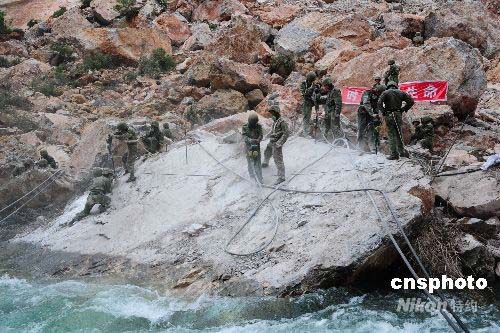 6月7日,經過解放軍官兵和鐵路職工25個晝夜的連續(xù)奮戰(zhàn),寶成鐵路109隧道段嘉陵江堰塞湖被成功疏通,這標志著預計在6月中旬疏通的109隧道和嘉陵江河道提前全部搶通。5月12日,四川汶川8級特大地震造成西安鐵路局管內寶成線109隧道附近山體突然坍塌,連接西北和西南的交通大動脈寶成鐵路中斷。約12萬方巨石將隧道旁的嘉陵江河道完全堵塞,形成一條長3.4公里、積水約100萬立方米的堰塞湖,嚴重威脅到寶成鐵路和沿江人民群眾生命財產安全。目前,解放軍官兵和鐵路職工已清理出一條長215米、寬25至50米、平均深度約5米的導流渠,基本達到迎夏度汛的要求。 中新社發(fā) 唐振江 攝