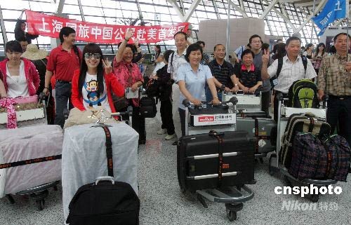 6月17日上午,上海赴美國旅游首發(fā)團共79名游客分兩批從浦東國際機場出發(fā),開始為期10天的美國游。此次首發(fā)團的10天行程游覽目的地主要涉及紐約、華盛頓、洛杉磯、費城等美國東西海岸主要城市,自由女神像、第五大道、華爾街、好萊塢大道等經(jīng)典景點,是首發(fā)團的必游之地。中新社發(fā) 湯彥俊 攝