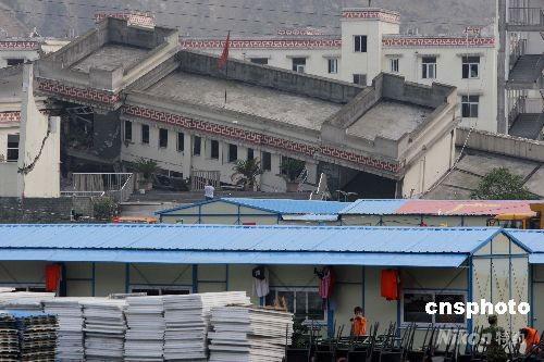 廣東省定點援建四川汶川大地震震中地區(qū)映秀鎮(zhèn),六月以來廣東省援建隊一直在該鎮(zhèn)漩口中學(xué)即將清理的廢墟旁開闊地搶建活動木屋區(qū)。中新社發(fā) 賈國榮 攝