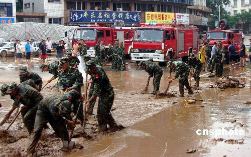 6月19日,洪水消退后的廣西桂林市平樂縣街道遺留大量淤泥和垃圾,桂林消防官兵與市民在忙著清理。此次南方暴雨使平樂縣遭受了幾十年不遇的洪災(zāi)。中新社發(fā) 王俊仕 攝