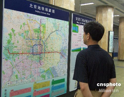 6月19日,北京地鐵全線開始更換新的線路圖,即將開通的10號(hào)線、8號(hào)線(奧運(yùn)支線)和機(jī)場(chǎng)線登上新線路圖。新線路圖以北京地圖作為底襯,用8種顏色表明8條地鐵線路。其中10號(hào)線為淺藍(lán)色,奧運(yùn)支線為綠色,機(jī)場(chǎng)線為灰色。中新社發(fā) 九州 攝