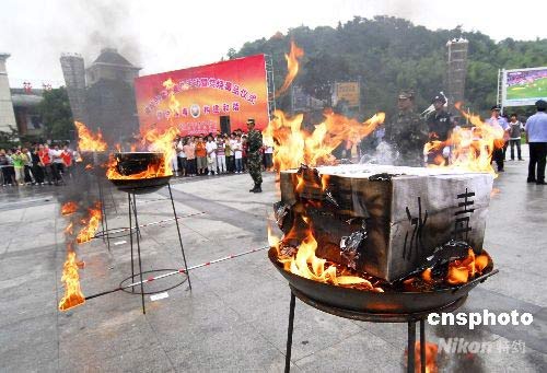 6月26日,國際禁毒日。浙江溫嶺市在東輝公園舉行廣場禁毒宣傳暨毒品焚燒儀式,焚燒海洛英、冰毒、麻古、搖頭丸等毒品20512克,總案值1600多萬元。溫嶺市還舉行了圖片展覽和簽名儀式,向群眾宣傳禁毒。中新社發(fā) 吳鵬飛 攝