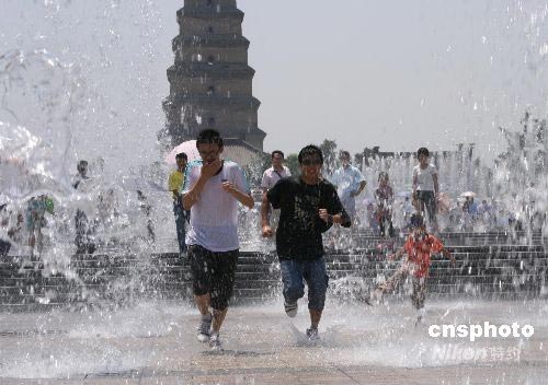 6月28日,西安當(dāng)日氣溫高達(dá)37攝氏度,市民們歡快地在大雁塔噴泉廣場(chǎng)上戲水降溫。中新社發(fā) 尤中原 攝