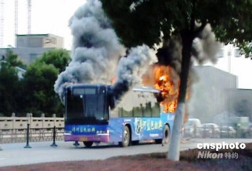 2008年7月6日下午16點(diǎn)58分,蘇州市一輛公交車在盤門路上行駛時(shí)突然發(fā)生自燃,蘇州消防特勤二中隊(duì)接警后迅速趕到現(xiàn)場將大火撲滅。據(jù)悉,該公交車自燃時(shí)車上乘客已全部安全下車,事故未造成人員傷亡。中新社發(fā) 朱子寒 攝