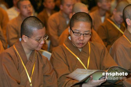 7月9日,“2008年佛教外語(yǔ)交流會(huì)”在上海玉佛寺舉行,海內(nèi)外百余位佛教界代表濟(jì)濟(jì)一堂,以英、韓、日等多種語(yǔ)言暢談開(kāi)展國(guó)際交流的經(jīng)驗(yàn)與心得。以佛光山為首的臺(tái)灣地區(qū)佛教界的二十余名外語(yǔ)人才代表,也應(yīng)邀出席。圖為來(lái)自臺(tái)灣的覺(jué)楷法師(左)和有智法師(右)在交流會(huì)上。中新社發(fā) 湯彥俊 攝