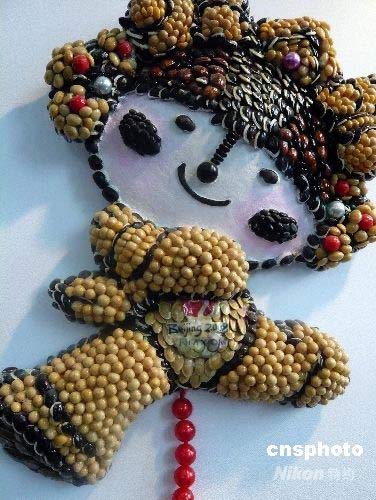 7月9日,為期一周的中國農(nóng)民藝術展在北京落下帷幕。展覽突出“民俗風、鄉(xiāng)土韻、奧運情”三大元素,由鄉(xiāng)村工藝名家作品展、中國農(nóng)民畫展、新中國農(nóng)業(yè)宣傳畫展三個部分組成。剪紙、皮影、織繡、印染、風箏、布藝、編結(竹編、草編)、雕塑(根雕、蛋雕、木雕、泥塑、面塑)以及獨具特色的葫蘆藝術、蝴蝶藝術、插花藝術、茶具藝術、微縮傳統(tǒng)農(nóng)具等作品在展覽上展出。圖為用豆子創(chuàng)作的奧運會福娃新穎別致。中新社發(fā) 錢興強 攝
