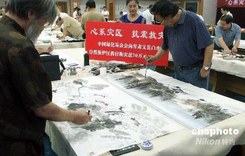 7月12日,中國(guó)汶川5.12大地震發(fā)生2個(gè)月,中國(guó)林業(yè)局、中國(guó)綠化基金會(huì)、中國(guó)藝術(shù)家生態(tài)文化工作委員會(huì)和中國(guó)美術(shù)館,聯(lián)合在北京舉行“心系災(zāi)區(qū)抗震救災(zāi)北京百位藝術(shù)家大型筆會(huì)捐款活動(dòng)”。中國(guó)林業(yè)集團(tuán)向中國(guó)綠化基金會(huì)捐贈(zèng)人民幣70萬(wàn)元,將全部用于支持甘肅省文縣災(zāi)區(qū)。圖為藝術(shù)家現(xiàn)場(chǎng)繪畫義賣。中新社發(fā) 錢興強(qiáng) 攝