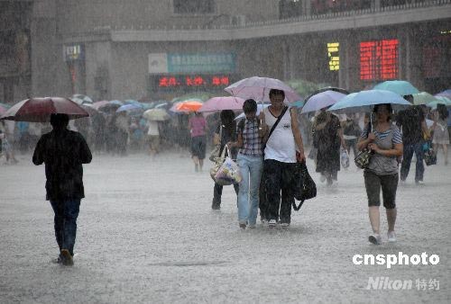 7月18日,游客冒雨行走在北京火車站廣場。當(dāng)日,北京遭遇強降雨,在雷聲轟鳴中,一場大雨傾盆而下,很多市民和游客猝不及防。中新社發(fā) 耿玉和 攝