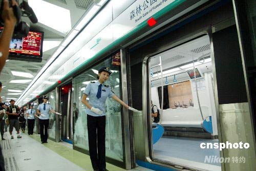 7月19日,北京地鐵10號線(一期)、奧運(yùn)支線、機(jī)場線開通試運(yùn)營儀式在地鐵10號線與奧運(yùn)支線交匯的北土城站舉行。這三條線路是2008年北京奧運(yùn)會的配套工程,同時也是北京市委、市政府方便廣大市民出行的一大重要舉措。10號線一期、奧運(yùn)支線、機(jī)場線三條軌道新線總長計58公里軌道,開通后北京軌道運(yùn)營里程已達(dá)到200公里,運(yùn)營線路將達(dá)到8條,北京軌道交通的網(wǎng)絡(luò)效應(yīng)將初步顯現(xiàn)。中新社發(fā) 富田 攝