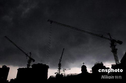 受2008年第七號臺風(fēng)“海鷗”的影響,7月18日下午4點30分左右,層層黑云籠罩廈門城區(qū)上空,晝夜難分,約10分鐘后,雷陣雨傾盆而下。據(jù)當(dāng)?shù)貧庀笈_消息,廈門受到臺風(fēng)外圍環(huán)流的影響,未來兩天可能出現(xiàn)中陣雨和雷陣雨,局部地區(qū)有大雨。中新社發(fā) 柳濤 攝