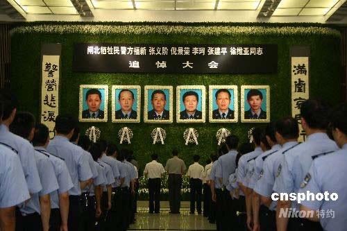 7月23日,上海閘北襲警案中6位犧牲民警追悼大會在龍華殯儀館舉行。民警的遺像被白色玫瑰簇?fù),上方橫幅書寫“閘北犧牲民警方福新、張義階、倪景榮、李珂、張建平、徐維亞同志追悼大會”,挽聯(lián)“滿堂哀思行祭禮,警營悲淚別戰(zhàn)友”,兩邊安放著社會各界送的花圈,現(xiàn)場氣氛肅穆凝重。中新社發(fā) 劉歆 攝