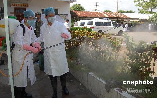 7月25日,廣西百色“7·21”煤礦透水事故已經(jīng)進入第5天,仍有29名礦工被困井下,生死不明,礦區(qū)開始全面消毒。該事故致使57人被困,其中21人獲救,7人遇難,29人至今被困。中新社發(fā) 劉萬強 攝