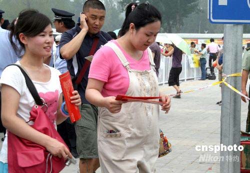 最后一批北京奧運(yùn)門票于25日正式開始銷售,大批市民前來搶購門票。圖為一位孕婦在家人的陪同下不畏酷暑也來購買奧運(yùn)門票。中新社發(fā) 葉林 攝