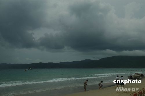 8月6日,受強(qiáng)熱帶風(fēng)暴“北冕”影響,海南三亞亞龍灣國(guó)家旅游度假區(qū)上空烏云密布,降雨不斷,沙灘上的游人相較往日有所減少。中新社發(fā) 尹海明 攝