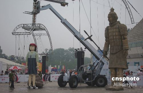 8月11日,《勇士和女孩》巨型木偶劇在在北京中華世紀(jì)壇奧運(yùn)活動(dòng)現(xiàn)場(chǎng)出演。主角是兩個(gè)高達(dá)22英尺(約6.7米)的提線木偶,演繹一個(gè)中國女孩和秦始皇兵馬俑之間的溫馨故事,通過古代與現(xiàn)代、智慧與天真兩個(gè)迥乎不同的形象突出了戲劇效果,體現(xiàn)了關(guān)愛、善良和友誼永恒等精神價(jià)值。中新社發(fā) 九州 攝