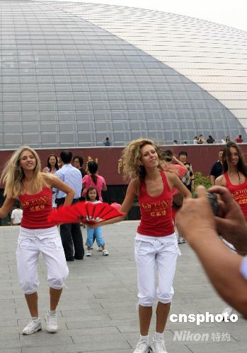 2008年8月26日,在為奧運助威后,烏克蘭著名啦啦隊“紅狐貍”在北京國家大劇院游覽,并在門前小廣場秀起紅扇舞,引來不少游客圍觀。 中新社發(fā) Yang Yang 攝