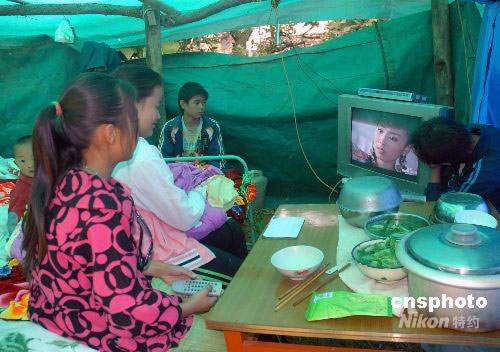 9月1日,經(jīng)過兩天的緊急救援,大批救援物資陸續(xù)到達四川省攀枝花地震災區(qū)。經(jīng)過相關部門緊張搶修,災區(qū)通訊、電力等基礎設施也正在逐步恢復中。圖為攀枝花市順利村幾名兒童圍坐在防震棚中觀看電視節(jié)目。中新社發(fā) 劉子倩 攝