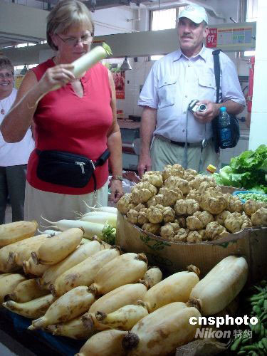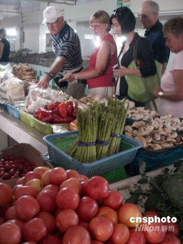 2008年9月1日,外國游人在蘇州雙塔菜場游覽。如今到蘇州旅游的外國游人越來越多,他們在游覽古典園林的同時,蘇州的菜市場也成為“老外”游客游覽的新景點。市場內(nèi)豐富的農(nóng)產(chǎn)品和當?shù)匕傩丈钗恕袄贤狻眰兊哪抗狻V行律绨l(fā) 王建康 攝