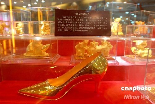 9月3日,在遼寧沈陽一黃金商店的柜臺(tái)內(nèi),一只一公斤重的純金高跟鞋吸引了很多顧客的目光。這只金鞋使用999千足金打造,5名技師歷經(jīng)48個(gè)工作日才完成。中新社發(fā) 孫海 攝