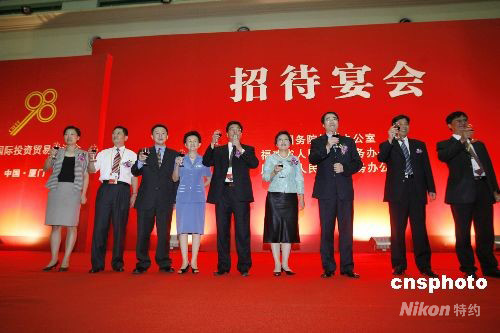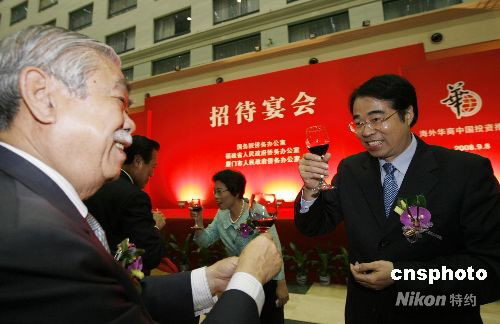 九月八日晚,國務(wù)院僑辦在廈門設(shè)宴款待出席“2008海外華商中國投資推介會(huì)”高端訪談及“改革開放三十年僑資企業(yè)成就展”的嘉賓,國務(wù)院僑辦、福建省僑辦及廈門市僑辦領(lǐng)導(dǎo)上臺(tái)感謝僑商僑資為祖國經(jīng)濟(jì)建設(shè)付出的努力。中新社發(fā) 王麗南 攝