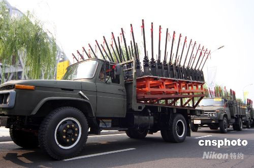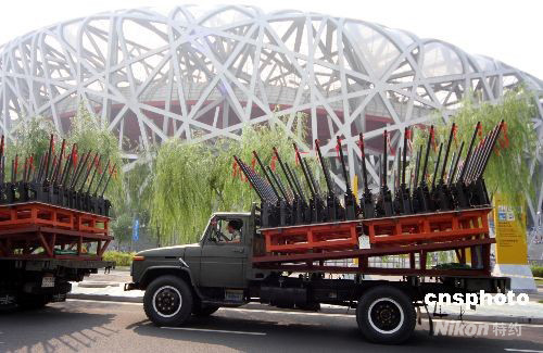 9月17日下午,多輛焰火禮炮專(zhuān)用車(chē)開(kāi)到國(guó)家體育場(chǎng)“鳥(niǎo)巢”,迎接2008北京殘奧會(huì)閉幕式。 中新社發(fā) 吳芒子 攝