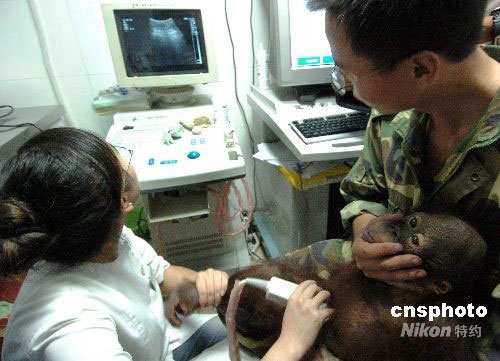 9月24日下午,杭州一家動物醫(yī)院為杭州野生動物園的一只幼年非洲獅和兩只幼年紅毛猩猩進(jìn)行腎結(jié)石檢查,檢查結(jié)果,這三只小動物均有輕度至中度的腎結(jié)石癥狀。 據(jù)了解,該動物園近兩年來一直選用“三鹿”牌奶粉輔助喂養(yǎng)部分動物幼崽,今年上半年以來,喂食奶粉的幼年獅、虎、猩猩、絨猴等普遍出現(xiàn)排尿淋漓,尿液發(fā)黃、渾濁,營養(yǎng)不良等癥狀。中新社發(fā) 施健學(xué) 攝