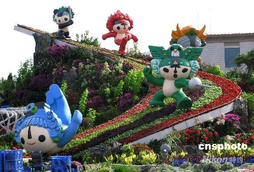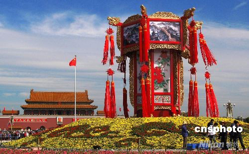 9月25日,北京天安門廣場(chǎng)“普天同慶”繁花錦簇的十一國(guó)慶花壇布置工程進(jìn)入了最后收尾階段。廣場(chǎng)東側(cè)的5個(gè)福娃花壇與中央9.9米高的民族傳統(tǒng)宮燈花壇相映成趣。中新社發(fā) 鄒憲 攝
