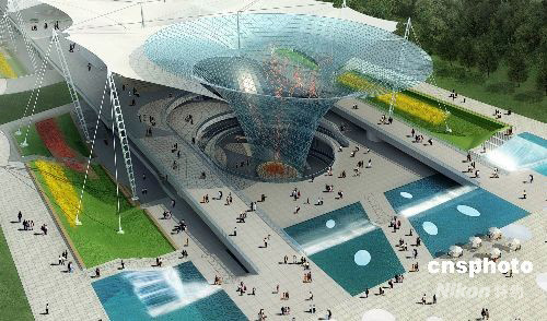 2010年上海世博會中央景觀道路“世博軸”進(jìn)入全面施工階段,圖為首次公布的“世博軸”主出入口“陽光谷”造型效果。據(jù)介紹,“世博軸”的一端也是上海世博園區(qū)的主出入口,整個“世博軸”在入口及沿途共設(shè)6個巨型圓錐狀“陽光谷”!瓣柟夤取辈捎娩摻Y(jié)構(gòu),其功能是讓自然光透過透明“圓錐”傾瀉入地下,滿足部分地下空間的采光,實現(xiàn)節(jié)能環(huán)保。 中新社發(fā) 世博局 攝