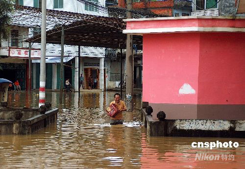 受“黑格比”影響,地處中越邊境的廣西龍州縣受來自越南水口河、平兒河兩河水暴漲影響,9月26日左江龍州水文站水位達116.21米,并以每小時0.52米的速度上漲。至當天下午18點,水位已達120.01米,造成龍州縣城的青龍橋、合龍街、白沙街、利民街等部分低洼地段民房、商鋪受淹。由于預(yù)防措施到位,及時轉(zhuǎn)移物品,損失不大。但沿江的上金鄉(xiāng)農(nóng)作物部分受淹。沒有人員傷亡報告。圖為青龍橋路段受淹,居民在趟水搶救物品。中新社發(fā) 馮文 攝