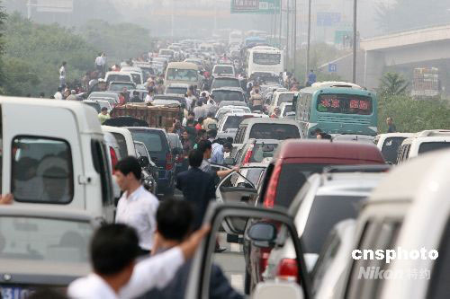 2008年10月1日,北京八達(dá)嶺高速公路出現(xiàn)爆堵。受出游車輛過多影響,中午12點之后,北京昌平西關(guān)到八達(dá)嶺水關(guān)路段幾近癱瘓,駕乘人員紛紛走出車外等候通車,甚至有人在路中間打球、打撲克以打發(fā)時間。中新社發(fā) 魯谷 攝