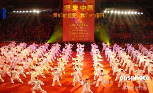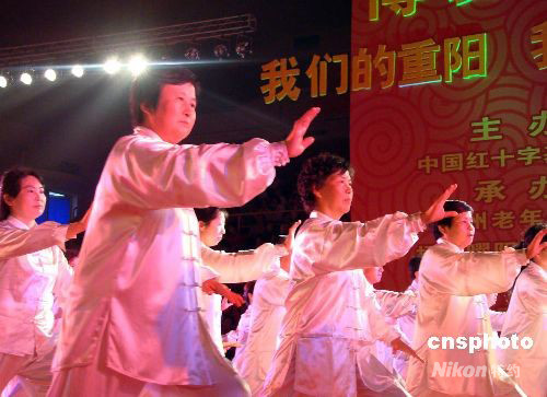 10月6日,揚(yáng)州150位老人同臺(tái)表演太極拳。當(dāng)天,由中國紅十字基金會(huì)主辦的“博愛中國•我們的重陽”大聯(lián)歡活動(dòng)在江蘇揚(yáng)州市體育場舉行,近千名老年朋友歡聚一堂,表演并觀看精彩紛呈的文藝演出,喜迎重陽節(jié)。 中新社發(fā) 陳中秋 攝