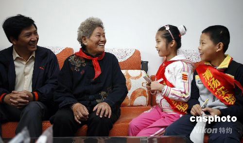 10月7日重陽(yáng)節(jié),無(wú)錫市清揚(yáng)實(shí)驗(yàn)小學(xué)為提高少先隊(duì)員尊老、敬老、愛老意識(shí),進(jìn)一步營(yíng)造全社會(huì)尊老愛老氛圍,結(jié)合“喜看家鄉(xiāng)改革開放30年巨變”,開展“和諧小使者訪名人”活動(dòng)。在世界上第一個(gè)從北坡登上珠峰的女英雄——潘多的家中,無(wú)錫市清揚(yáng)實(shí)驗(yàn)小學(xué)的少先隊(duì)員們與潘多奶奶面對(duì)面地交流著。潘多奶奶勉勵(lì)少先隊(duì)員要在學(xué)習(xí)上要發(fā)揚(yáng)“攀登”精神,克服困難,勇攀學(xué)習(xí)高峰。 中新社發(fā) 張浩 攝
