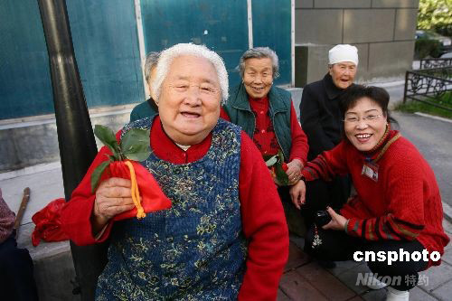 圖:北京社區(qū)老人佩戴茱萸囊歡度重陽節(jié)