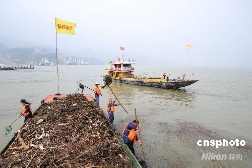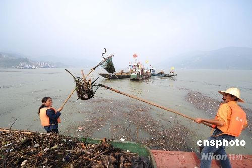 10月7日,由湖北秭歸環(huán)保局組織的清漂隊(duì)在三峽大壩上游西陵峽水域開展清漂作業(yè)。當(dāng)日,為保障蓄水期間長江航道安全和三峽電站正常發(fā)電,沿江各地緊急投入人力物力,啟動(dòng)大規(guī)模清漂行動(dòng)。中新社發(fā) 林中樹 攝