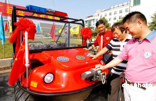 10月9日上午,一輛水陸兩棲全地型功能車交付中國南極科考隊,并將于10月20日搭乘“雪龍?zhí)枴?投入笫25次南極科學(xué)考察。這次奔赴南極笫25次科考的水陸兩棲全地型功能車,專門針對南極復(fù)雜的地形和氣候,對車體、輪胎、散熱系統(tǒng)、變速檔位都進行改進,裝上防冰刀扎的防爆輪胎,并增配了自動牽引鉤、牽引鋼絲繩、水上推進的螺旋槳及警示燈。中新社發(fā) 張建成 攝
