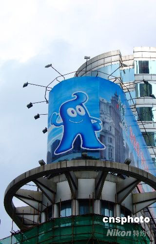 2008年10月9日,上海在迎世博600日活動(dòng)中高潮迭起,“海寶”形象紛紛登上高樓。中新社發(fā) 蔣振雄 攝