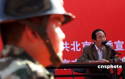 2008年10月11日,第八屆北京圖書節(jié)在地壇公園舉行,百家講壇學(xué)者閻崇年專門來到地壇圖書節(jié)與廣大讀者交流清史。由于閻崇年無錫簽售遭遇“耳光”事件,為防止此類事件再次發(fā)生,主辦方請(qǐng)來多名頭戴鋼盔的保安在現(xiàn)場(chǎng)維持秩序。中新社發(fā) 吳芒子 攝