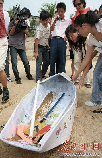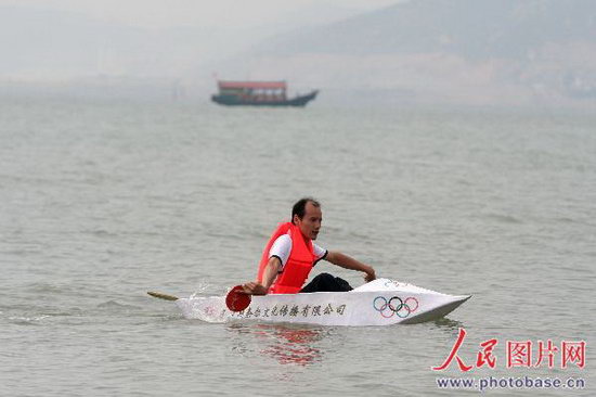 福建省廈門市廈大白城海面上,朱亞林坐在自己親手打造的紙船用乒乓球當(dāng)作雙槳開(kāi)始試航。