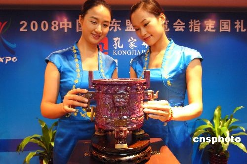 10月14日,廣西南寧舉行的中國—東盟博覽會新聞發(fā)布會宣布,產于河南禹州孔家鈞窯的鈞瓷《象天鼎》被確定為第五屆中國—東盟博覽會國禮。《象天鼎》由中國工藝美術大師孔相卿設計,以中國古老的青銅禮器“鼎”為基本造型設計制作,表達了中國與東盟國家互利合作、共享繁榮的美好愿望。中新社發(fā) 牛書培 攝